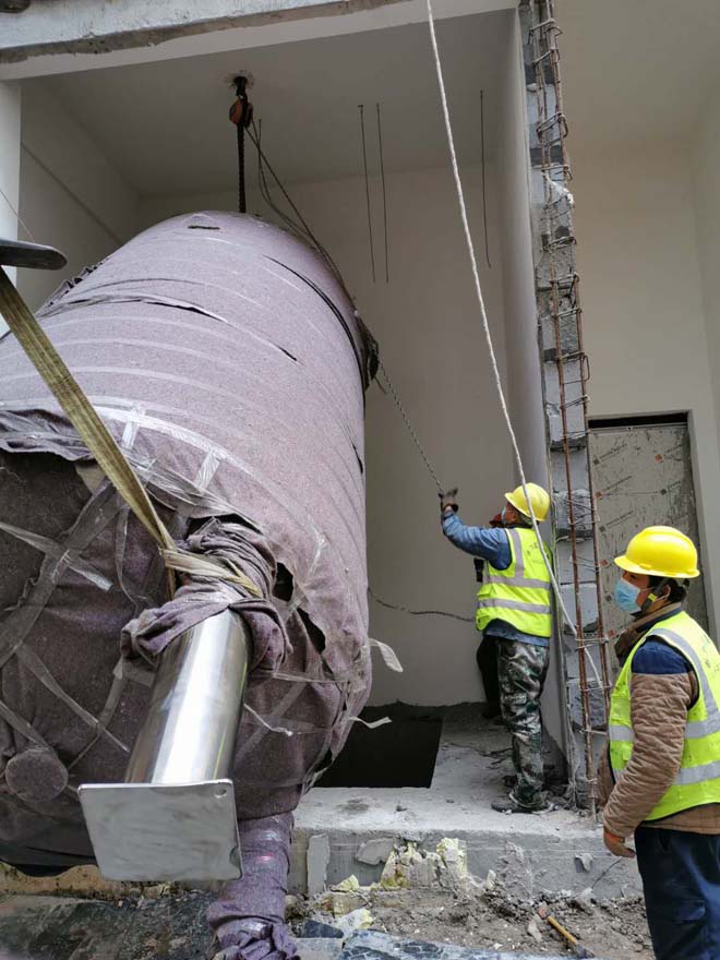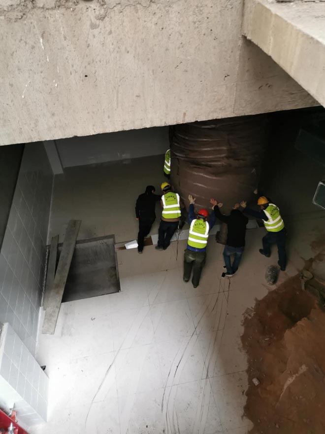 大型儲水罐設備人工吊裝下負3層地下室現場